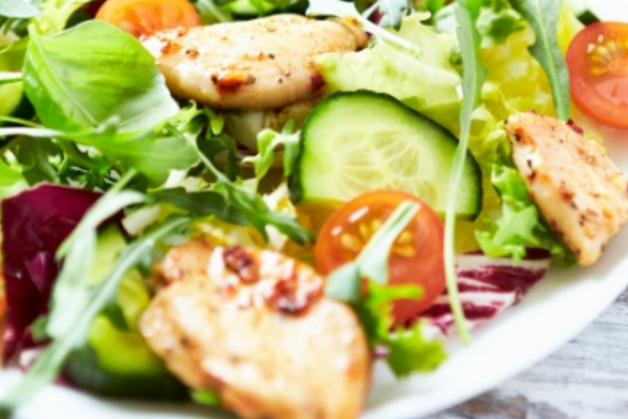 Grüner Salat, Gurken, Möhren, Hähnchenbrust, Parmesankäse